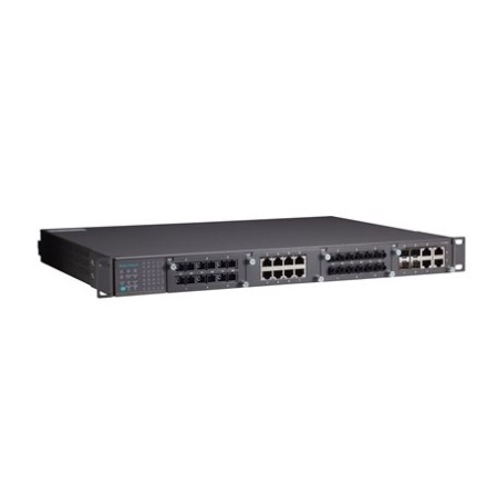 IEC 61850-3 Layer 3 sistema de switch Ethernet modular montado en rack con 3 ranuras para módulos Fast Ethernet y 1 ranura para módulos Gigabit Ethernet, para un total de hasta 24 puertos + 4G, cableado en el panel frontal, 2 fuentes de alimentación aisladas (88- 300 VCC o 85-264 VCA), temperatura de funcionamiento de -40 a 85 ° C.